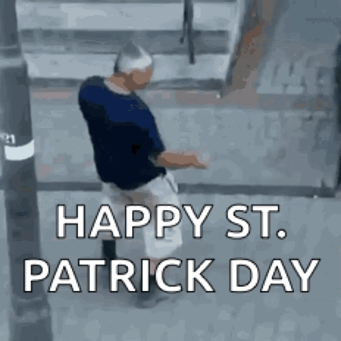 Апісанне змесціва: a man is standing on a sidewalk with the words `` happy st. patrick 's day '' written on it .