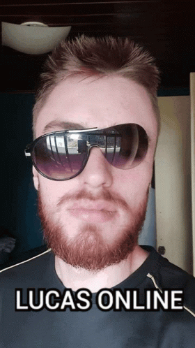 Апісанне змесціва: a man with a beard wearing sunglasses and the name lucas online below him