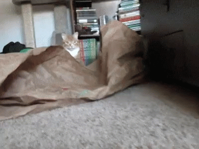 Описание на съдържанието: a cat is sitting in a brown paper bag