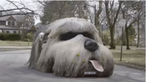 Описание на съдържанието: a giant dog is driving down a street in a car .