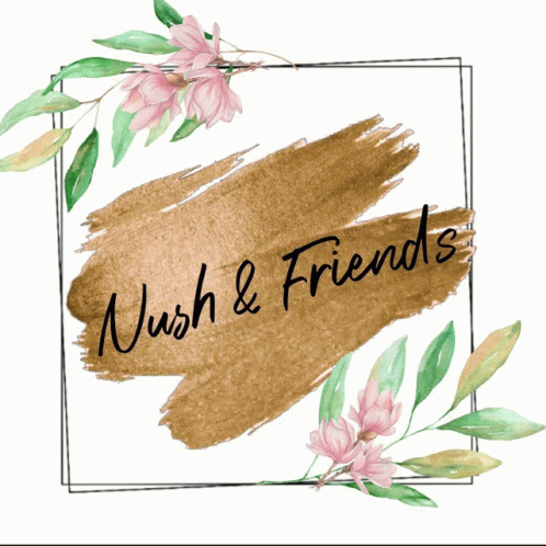 Описание на съдържанието: a logo for nush & friends with flowers and leaves around it