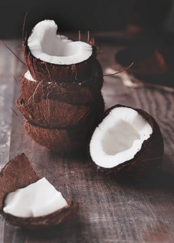 કન્ટેન્ટનું વર્ણન: three coconuts are stacked on top of each other and one has been peeled