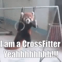 કન્ટેન્ટનું વર્ણન: a red panda is wearing headphones and hanging on a bar with the words i am a crossfitter