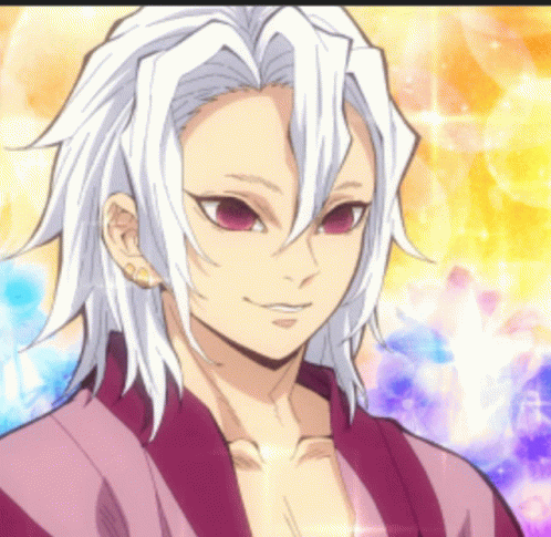 Inhaltsbeschreibung: a man with white hair and red eyes is wearing a pink shirt