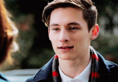 a young man wearing a plaid scarf and a jacket looks at a woman