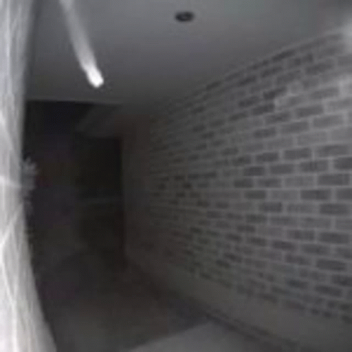 Inhaltsbeschreibung: it is a black and white photo of a hallway with a brick wall .