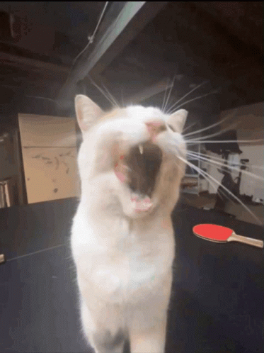 Inhaltsbeschreibung: a white cat yawning with a ping pong paddle behind it