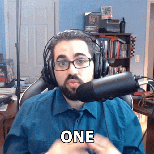 Inhaltsbeschreibung: a man wearing headphones and a blue shirt says " one "