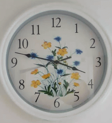 Content Description: a clock with yellow and blue flowers on the face shows the time as 4:20