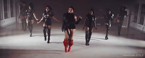Content description: a group of women are dancing in a dark room . one of the women is wearing red boots .