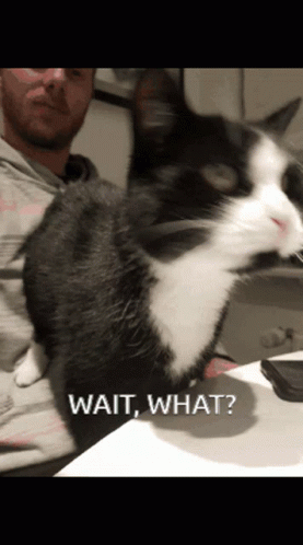 Content description: a man is holding a black and white cat with the words wait what written below it