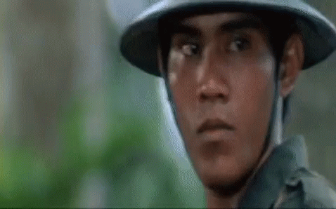 Content description: a close up of a soldier wearing a helmet looking at the camera .