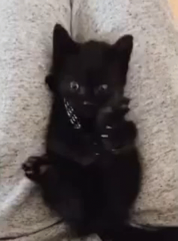 Content description: a black kitten is laying on a person 's lap on a couch .