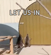 a chimpanzee is standing in front of a door that says me when me when the on it .