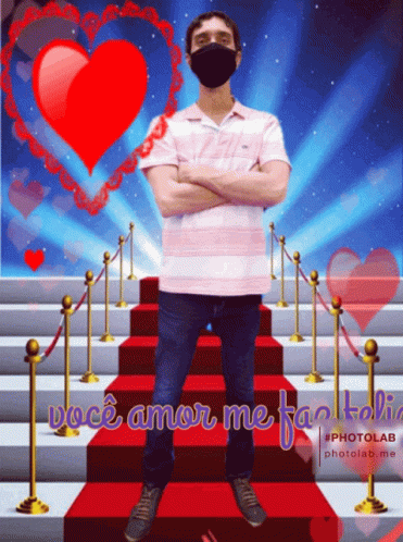 Content description: a man wearing a mask is standing on a red carpet with the words " você amor me faz tolo " on the bottom