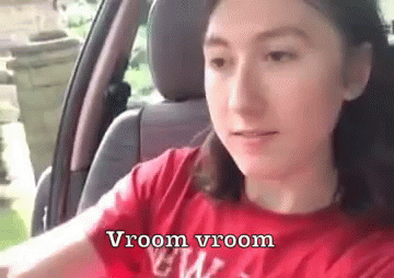 Content description: a woman in a red shirt is sitting in a car with the words vroom vroom written on her shirt .