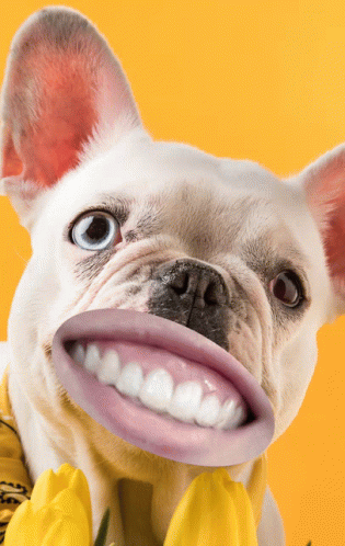 Content description: a close up of a dog with a fake mouth and yellow flowers