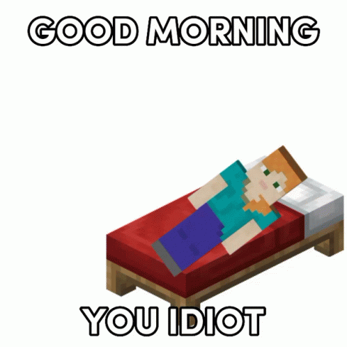 Content description: a minecraft character standing next to a bed with the words good morning you idiot