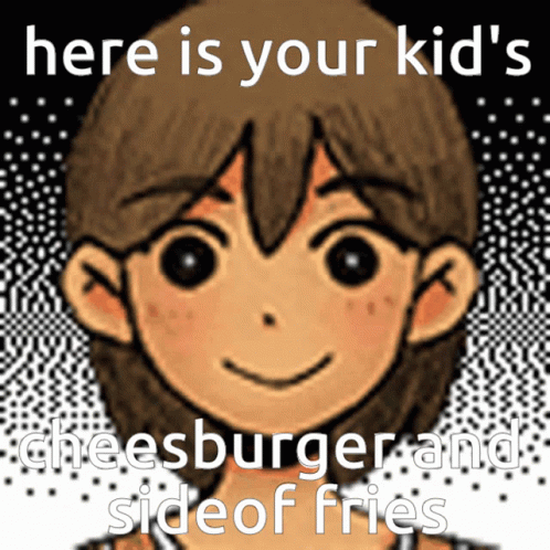Content description: a cartoon of a boy with the words here is your kid 's cheeseburger and side of fries