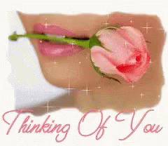 Content description: a picture of a woman with a rose in her mouth and the words " thinking of you " below it