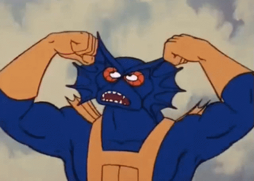 Content description: a cartoon character is flexing his muscles and making a funny face .