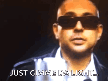 Content description: a man wearing sunglasses and a black jacket says just gimme da light