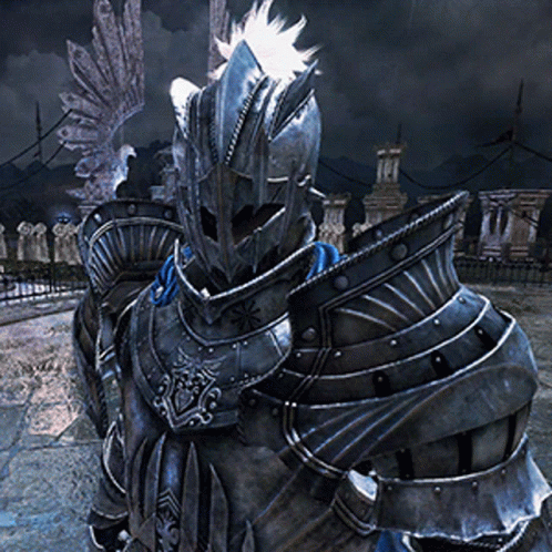 Content description: a knight wearing a helmet and armor is standing in front of a cemetery