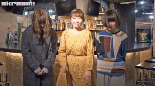 Content description: three women are standing in front of a bar with skriam written on the bottom