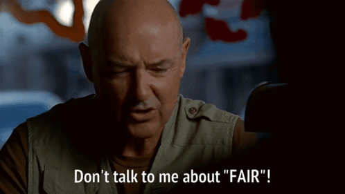 Content description: an older man says " do n't talk to me about fair "