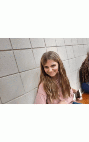 Content description: a girl in a pink shirt is sitting in front of a white tiled wall