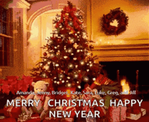 Content description: a merry christmas and happy new year greeting card with a christmas tree