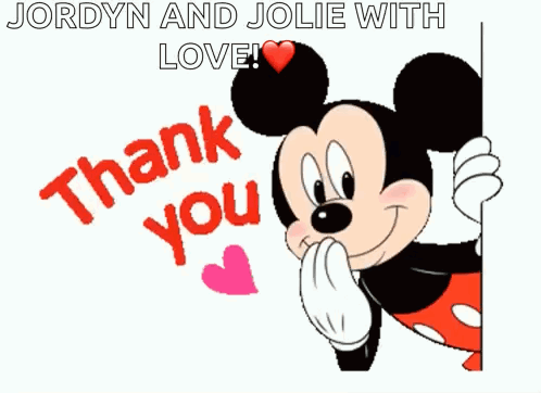 Content description: a picture of mickey mouse saying thank you with jordyn and jolie with love