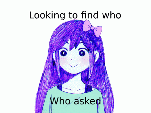 Content description: a drawing of a girl with purple hair and the words " looking to find who who asked " below it