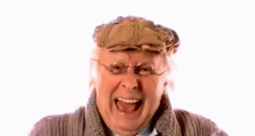 Descripción del contenido: an elderly man wearing glasses and a hat is laughing and making a funny face .