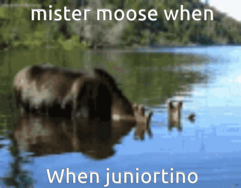 Descripción del contenido: a moose is swimming in a lake with the caption mister moose when juniortino