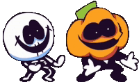 two cartoon characters , a skeleton and a pumpkin , are dancing together .