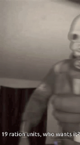 - Descripción del contenido: a black and white photo of a person holding a bottle with the words 19 ration units who wants it .