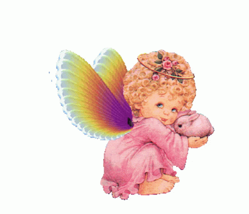 Descripción del contenido: a little angel with rainbow colored wings is holding a pink pig