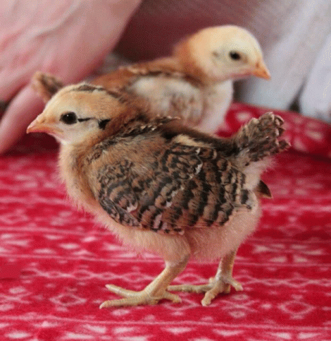 Descripción del contenido: two baby chickens standing on a red and white blanket
