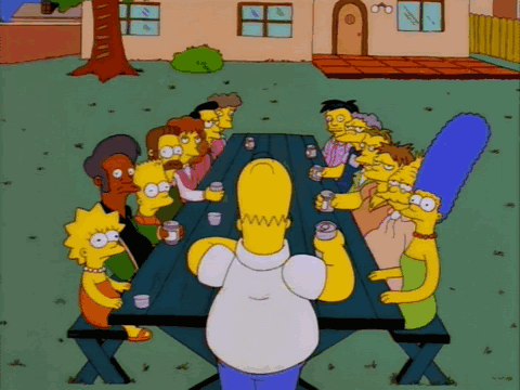homer simpson stands in front of a picnic table with a group of simpsons