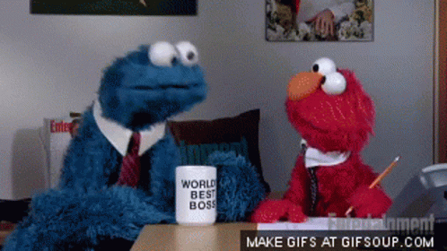 Descripción del contenido: elmo and cookie monster sitting at a table with a mug that says world best boss on it