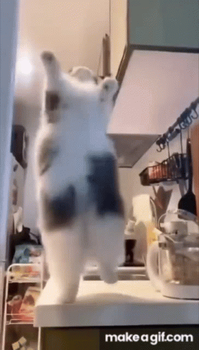 Descripción del contenido: a cat is standing on its hind legs on top of a counter in a kitchen .