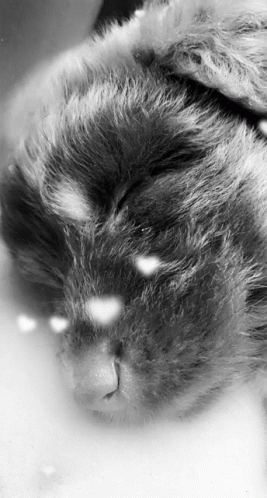 Descripción del contenido: a black and white photo of a cat sleeping with snow falling on its nose