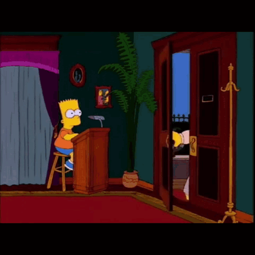 Descripción del contenido: bart simpson is giving a speech in front of a podium while an elderly man stands in front of a door