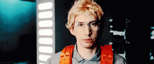 Descripción del contenido: a man with blonde hair and glasses is wearing a gray shirt and orange harness .