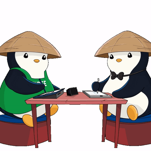 a cartoon of a penguin sitting at a desk with the word pengu on the bottom