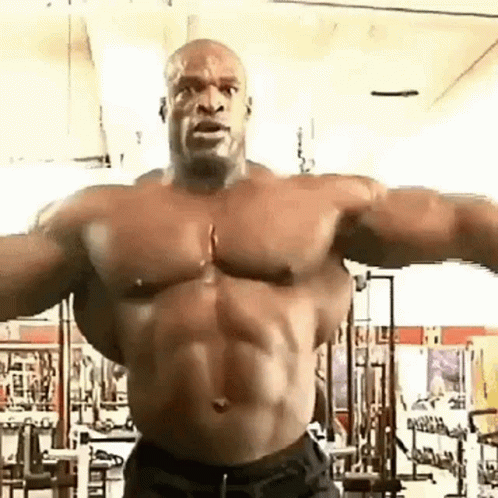 a bodybuilder is standing in a gym with a barbell on his shoulders .