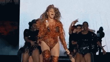 Descripción del contenido: a woman is singing into a microphone on a stage while a group of dancers are behind her .