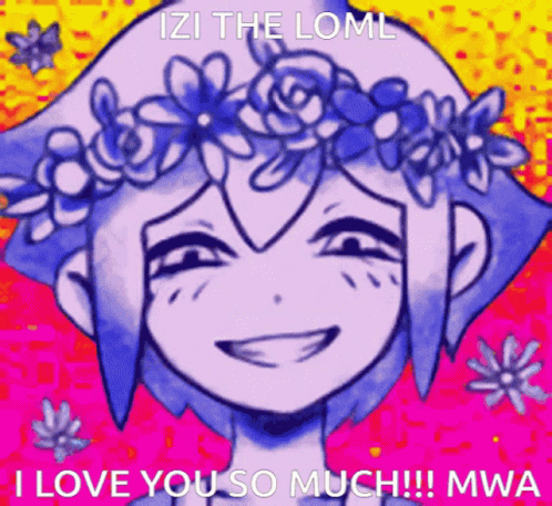 Descripción del contenido: a drawing of a girl with flowers on her head and the words izi the loml i love you so much !! mwa