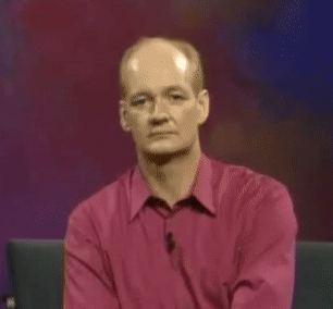 a man in an orange shirt is making a funny face in front of a tv pg d sign